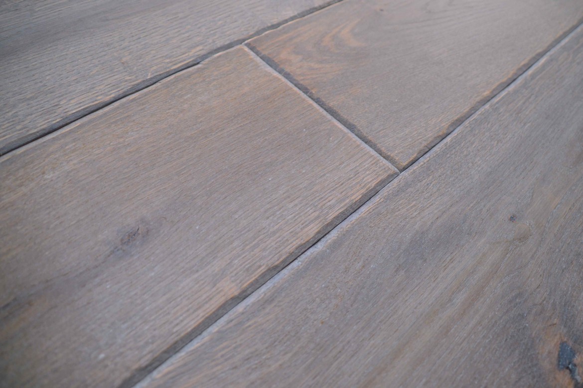 variant - ručne hobľované hrany, jemný kartáč, odtieň získaný reakciou v dreve zdôraznený svetlo sivým olejom, tvrdý voskový olej
